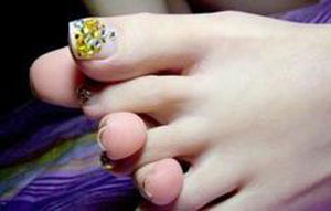 洗净足部,将双足浸入海盐水中,待5到10分钟后,用剪刀修剪齿甲周围的死皮和过长的芷甲,接着在整个足部涂上去死皮膏,让其在足部停留5分钟后,将足部洗干净,擦干。