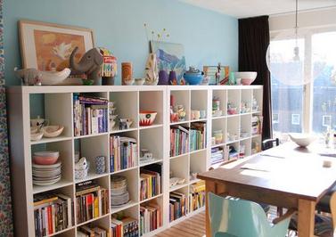 在用来安放顶架的那些凹口处钻孔,插上螺丝钉,穿过木板,在墙上相应的点上钻孔以做固定之用。如果担心凹口处的木料不够,可以在凹口上方的木板上钻孔。 整个书架成形了,也看不见这些小孔,绝对美观。这样从外面是看不见螺丝钉的,感觉书架仿佛是独立存在的。