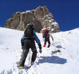 登山杖使用方法三:在上比较平缓的坡时,一般都采用和平常走路一样的节奏和脚步,只要保持杖尖不要超过身体就可以了。