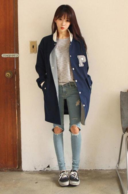如图片所示范的棒球服搭配破洞牛仔裤和休闲板鞋,整体充分体现了欧美朋克精神。选择长款棒球外套,简单而不失帅气。