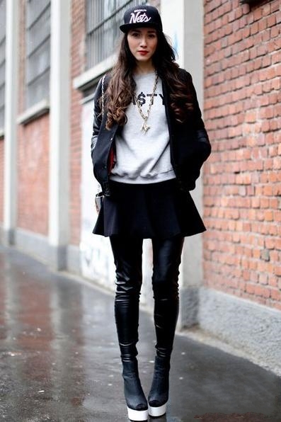 四、棒球服怎么搭配时尚之黑色皮质打底裤+及踝靴