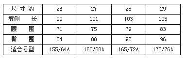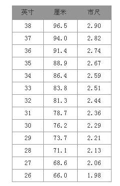 下图就是标准的裤子尺码表,顾客可以参照此裤子尺码对照表选择: