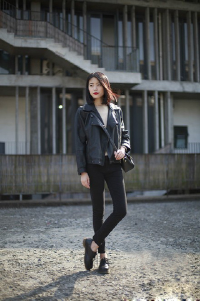 全身黑也可以有不一样的穿搭方式,比如这件黑色小脚裤,配上一双复古鞋,绝对是高挑妹子的最爱。上身的穿搭上可以选择机车皮衣,短款的机车皮衣更加拉长你的腿部线条,内搭一件纯T恤就可以啦!