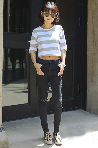 黑色小脚裤搭配什么鞋子好?不喜欢女人味喜欢个性潮范的你可以选择这样搭配,深色的小脚裤很有潮流look配上破洞元素更显得你很有个性摩登不羁,鞋子配上一款豹纹的单鞋简约大气更显大牌风,也让双腿看起来很秀丽,上面配一款经典的条纹T恤,短款露脐装秀蛮腰更清凉俏皮,中袖遮住您尴尬的肉肉臂。
