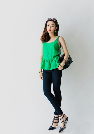 黑色小脚裤上面用一款亮色的夏装,娃娃衫款式甜美能遮肉。优雅范儿的尖跟鞋款式能够修饰出好的腿型来,这款罗马尖跟鞋还能显得你的脚小,搭配一款黑色小脚裤,传说中筷子腿你也能打造!