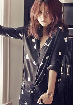 李孝利身穿黑色印花衬衫,下面搭配印花短裤,白色的蝴蝶印花点缀其中,清新灵动,采用v领设计的衬衫极具诱人气息,将衬衫扎进短裤中,时尚有范儿,尽显性感女神的魅力。