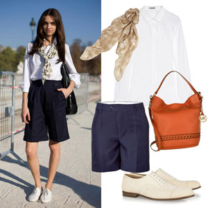白衬衫也能看起来年轻又有活力,平整的工装短裤加上系带平底鞋呈现出清爽的率性的感觉,将丝巾随意的在胸前打个结是不是很有学生气质呢?
