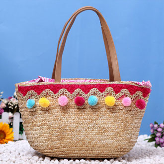 森林系草编包森女单肩包田园日系编织包包彩色花球。