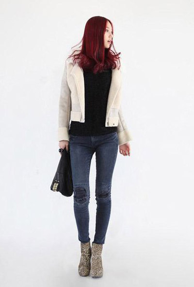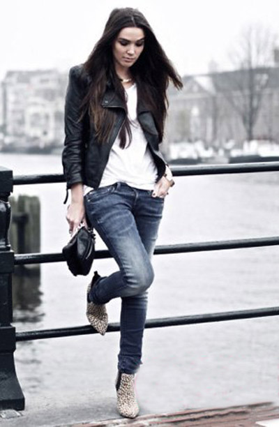 想要打造豹纹鞋的街头风,必然少不了皮衣和牛仔裤了,这几个单品搭配在一起,有一种酷炫十足的装扮。打底衫则是选用白色T恤来搭配黑色皮衣和牛仔裤,简单的个性加上豹纹鞋后,更增加了时尚感。