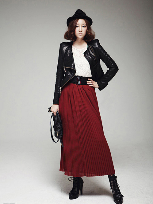 黑色皮衣是非常酷的单品,很有街头机车范,搭配一件复古红百褶长裙中和了这股霸气,然后搭配双系带高跟短靴,十足女王范,想要驾驭这种风格就去尝试吧。