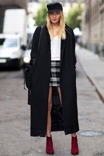 这组搭配十足欧美范,一件及踝黑色大长款外套,内搭一件白色衬衫和格子半身裙,霸气外露,十分有范,喜欢的人就收起来吧。
