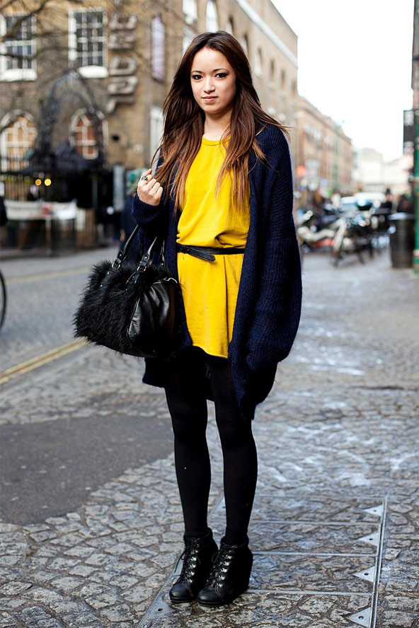 黑色外衣总能给我们时尚干练的感觉,非常适合酷酷的人穿着,看图中的搭配,里面搭配一件鲜黄色长款衬衫,用一根细腰带勾勒出曼妙身姿,外搭一件黑色长款针织衫外套,非常简单大方,很多场合都适合。