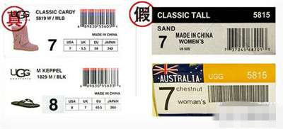正品UGG鞋类的产品标签一般都是比较一致的,上面会有鞋的样子图示,产品标志,条形码等。条形码的最上方有一条是红色的。而高仿的一般没有鞋子的样子图,条形码全是黑色的,最左端有一个“7”的标志。我们在下图中就可以看出真假标签的不同了。