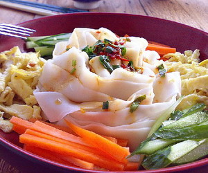主料:干阔面条、红萝卜、黄瓜、鸡蛋各适量